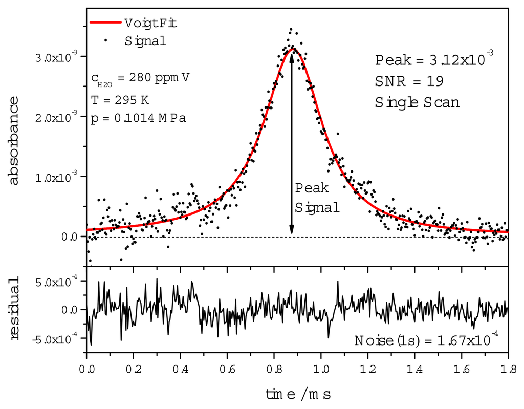 To validate the spectroscopic scheme, measurements over the range of 50–3500 ppmV H2O in air were carried out using the experimental setup described in Section 3.1. A typical dTDLAS scan at 280 ppmV (T = 295 K, p = 0.1014 MPa) with a peak absorbance of 0.31% is shown in Figure 11 where the electronic noise clearly influences the measurement quality resulting in a SNR of 19.