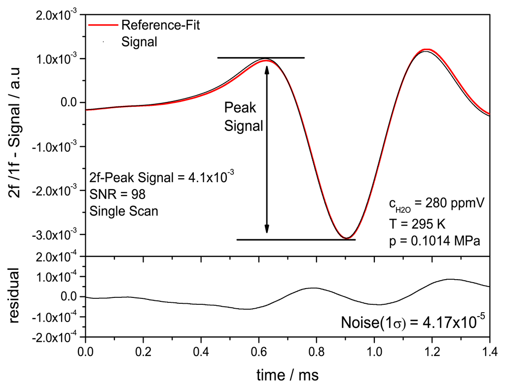 Figure 12 shows the quasi-simultaneously acquired single scan normalized WMS-2f/1f scan at a H2O concentration of 280 ppmV in air (T = 295 K, p = 0.1014 MPa). The fit is realized using the linear regression against reference spectra at 750 ppmV as explained above. A SNR of 98 was obtained and a standard deviation of 4.17 × 10−5. Here the SNR for the WMS-2f/1f measurement is defined as the peak to peak difference divided by the standard deviation of the residual. Fitting routines for WMS and dTDLAS were implemented using LabVIEW. Comparing the single shot WMS to the simultaneous acquired single shot dTDLAS signals shows a fivefold increase of SNR. This illustrates the benefit using the time division multiplexed dTDLAS-WMS detection scheme. The SNR is currently mainly limited by the deviation of the correlative fit, hence the SNR could be further optimized by referencing to multiple scans at different concentrations or even further by an improved fitting procedure.