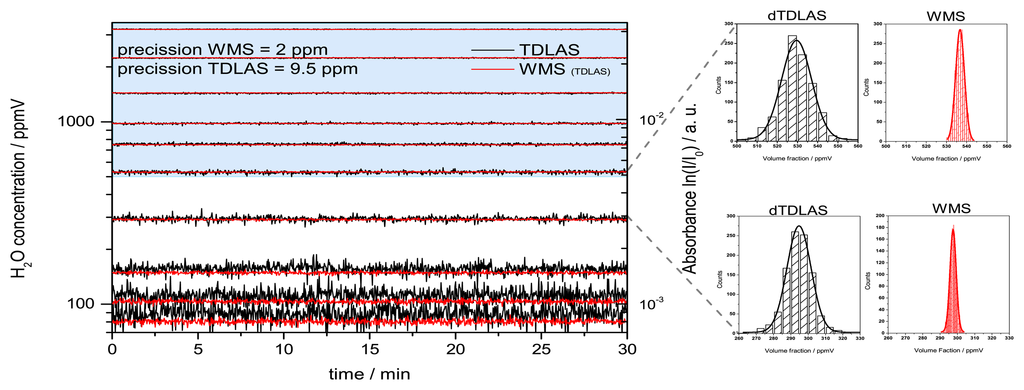 The histograms in Figure 13 show nice Gaussian distributions. The half width half maximum (HWHM) of the Gaussian profile correspond to the measurement precision of 9.5 ppmV (dTDLAS) and 2 ppmV (WMS), which corresponds also to the standard deviation of this H2O level. It should be mentioned that the stability and precision of these concentration measurements are also affected by the humidity generator stability which is specified by the manufacturer to be about 0.1% relative to the ppmV level. The WMS-2f/1f measurements display clearly an enhanced precision compared to dTDLAS. This enables concentration measurements with an increased precision and makes measurements at lower concentration levels possible, where dTDLAS measurements have a smaller SNR due to a higher noise level.