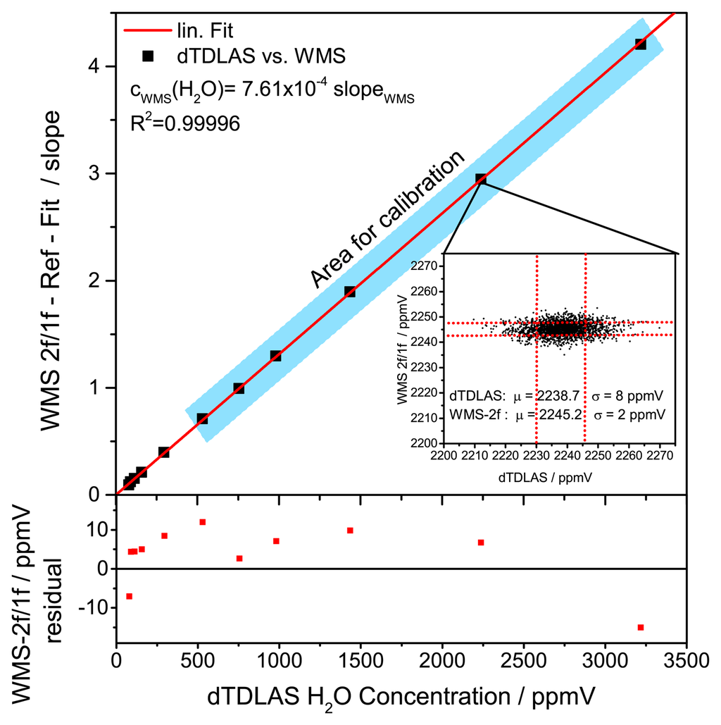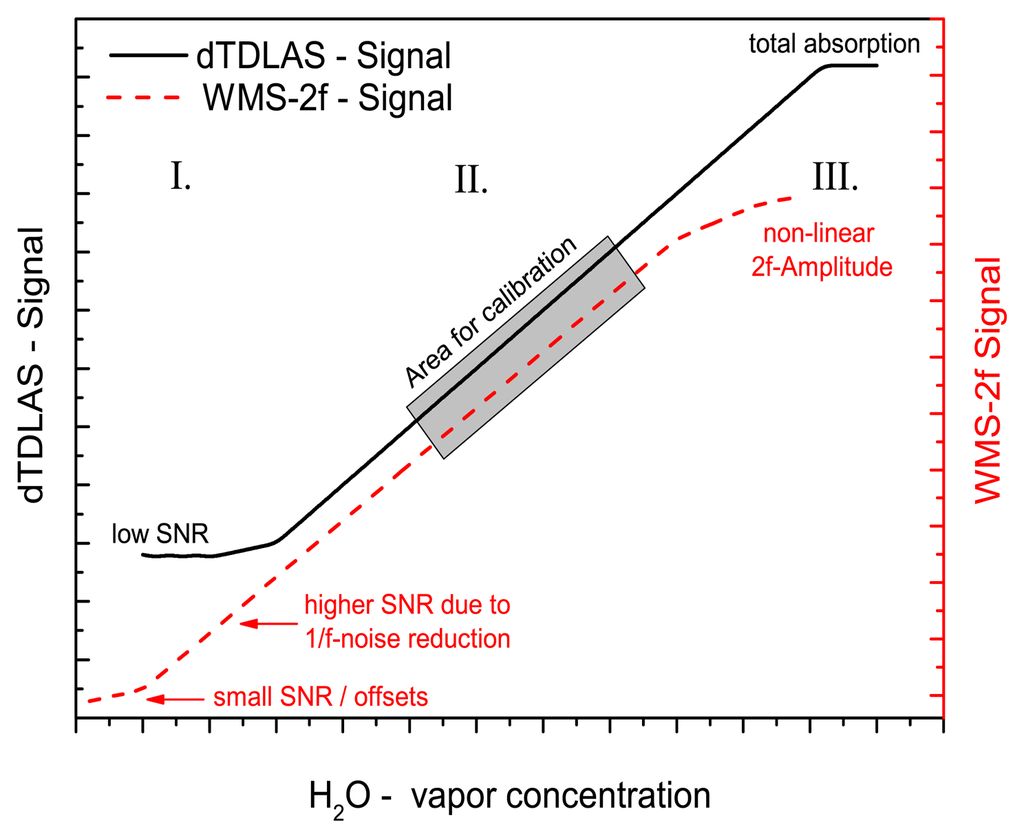 Figure 4 schematically illustrates how the two spectroscopic techniques are combined for WMS calibration. When the molecular absorbance (ln(I/I0)) is above 0.1 solely the dTDLAS signal is used as the WMS signal at high absorptions scales nonlinear with H2O concentration. In the absorbance range below 0.1 the normalized 2f/1f WMS signal is calibrated against the absolute concentration gained from dTDLAS with a sufficient SNR.