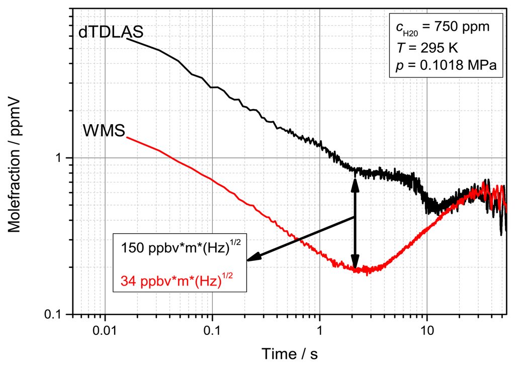 To further compare the two spectroscopic techniques a calculation of the Allan deviation of a simultaneously measured concentration of 750 ppmV was conducted (Figure 15). The optimal precision for the time multiplexed measurements was achieved with the WMS signal already after 2 s (125 scans) of averaging and resulted in a normalized sensitivity of 34 ppbV·m·(Hz)1/2. After 1 s the dTDLAS approach shows a four times worse normalized precision of 150 ppbV·m·(Hz)1/2. The Allan deviation also indicates that the lowest stable precision for the WMS measurements needs less averaging time. WMS could therefore be used to increase the time resolution of calibration-free absorption measurements. After 10 s averaging both measurements show a similar unstable deviation, which we interpret as fluctuations and drifts of the humidity generator, probably caused by the control loop.