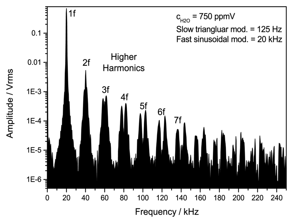 WMS utilizes a more complex laser modulation to generate higher harmonics of the absorption signal, thereby shifting the measured signals to higher frequencies to reduce 1/f intensity noise via phase sensitive detection e.g., lock-in amplifier. Here, fast sinusoidal modulation in the kHz-range is superimposed on the slower modulation with a linear slope as used in dTDLAS. Due to the nonlinear nature of the molecular absorption lineshape, higher harmonics are generated at multiple frequencies of the fundamental sinusoidal modulation frequency. The time dependent wavelength of the laser can be described as: