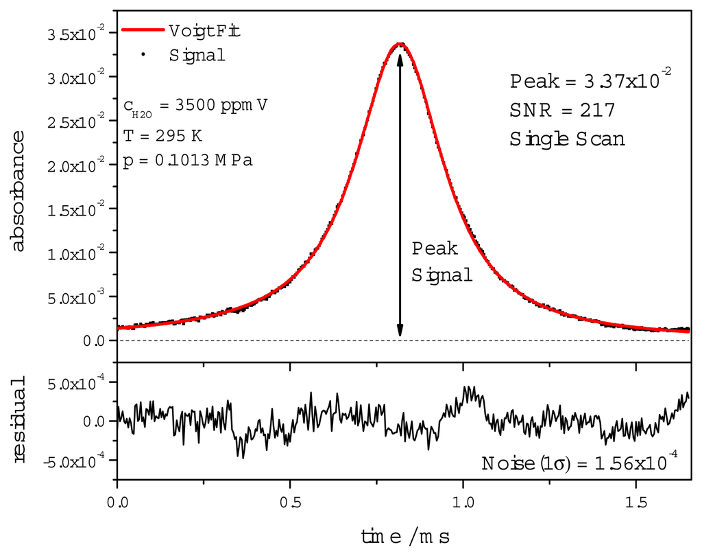 The model function used for dTDLAS scan fitting is composed of a third order polynomial function for the baseline and a Voigt line shape function for the absorption line. The line width is calculated from broadening coefficients based on HITRAN [28] and measured gas pressure and temperature in order to minimize the degrees of freedom of the fit. Figure 5 shows a typical single dTDLAS scan at 3500 ppmV with an absorbance of 3.4% and a SNR of 217.