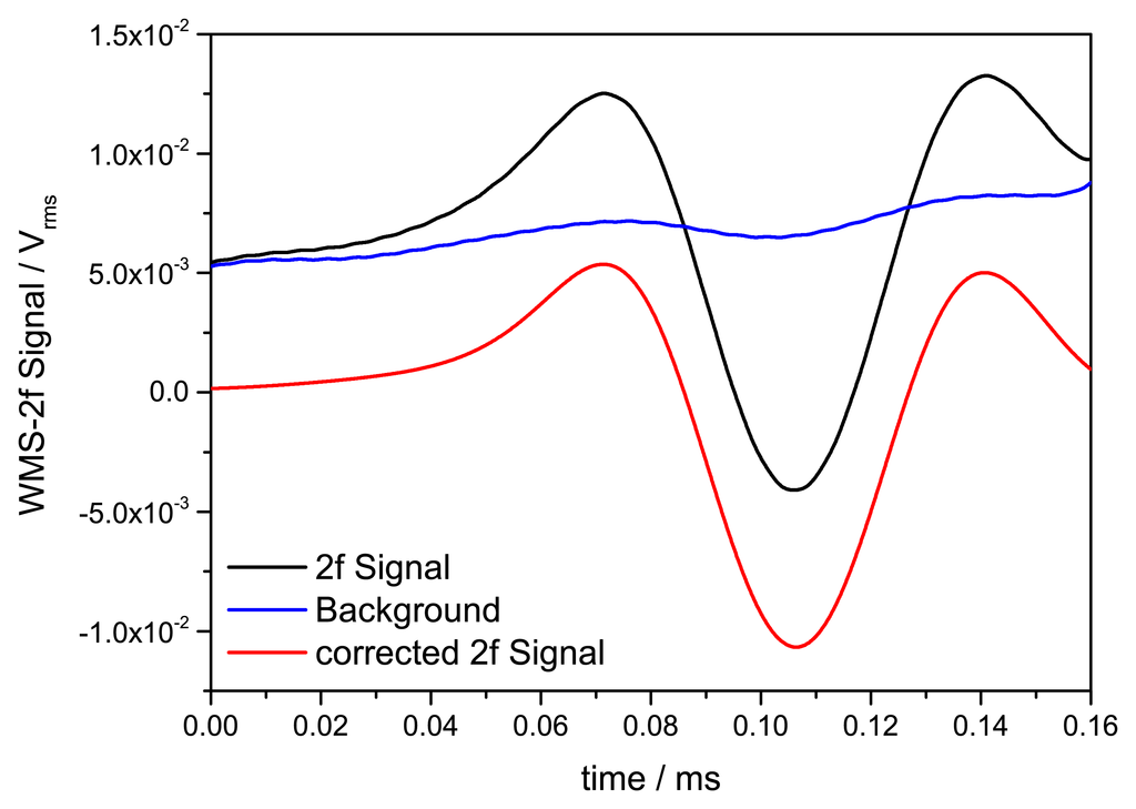 To derive 2f signal the WMS raw signal is demodulated at 40 kHz (Figure 6). Our measured 2f signal shows an additive background caused by residual amplitude modulation (RAM) due to the nonlinear intensity modulation of the laser. To correct this background, measurements in the absence of H2O absorption were conducted. To reduce minor fluctuations of this background correction a 100 times scan averaged signal was used for subsequent background subtraction. A time series of the background measurement was taken to verify a stable RAM background without drifts due to the laser or electronic instability. Figure 7 shows the stability of the background measurement for a time span of 10 min. No drifts can be observed. Fast minor background fluctuations in the order of 5.3 × 10−5 Vrms are caused by electronic noise.