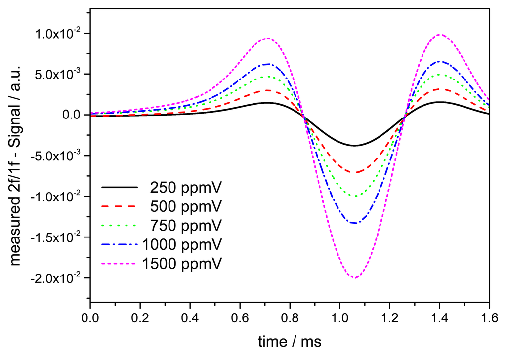 After background correction the WMS-2f signal is normalized to the simultaneously demodulated 1f signal to account for transmission fluctuations. Figure 8 displays the measured WMS-2f/1f signal for concentration steps from 250 ppmV to 1500 ppmV indicating the linear response of the normalized WMS-2f/1f peak to the concentration level.