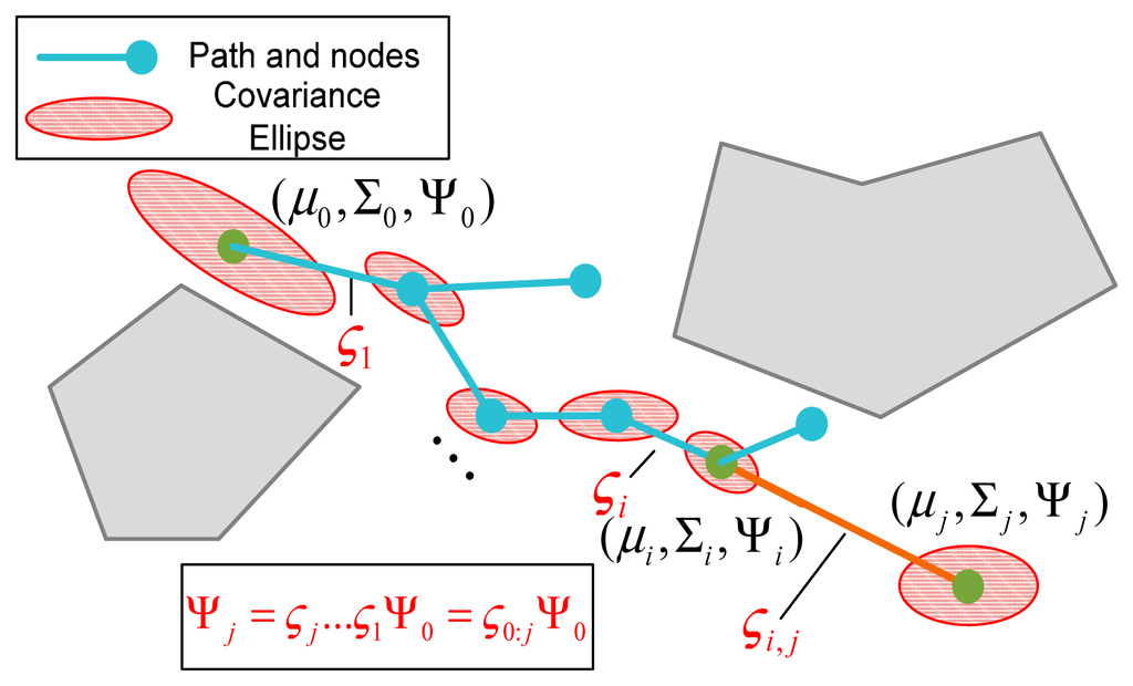 In order to evaluate the state uncertainty resulting from a specific planned trajectory, the most common approach for a system with the EKF estimator is to compute the posterior covariance of the ending belief b(xt) from the sequence of actions and measurements along the trajectory. However, the propagation of the posterior covariance requires multiple iterative calculations of the EKF process and measurement updating from the initial belief according to Equation (4), leading to a heavy computational cost. This is even worse when the initial belief is modified, since the posterior covariance must be re-computed using the entire EKF updates from the new initial belief. In particular, this fact has a more significant effect on a sampling-based motion planner, since it generally constructs a graph and tree of multiple trajectories, thus different paths can result in different posterior covariance to the same node, this requires that the motion planner must perform the propagation process for each covariance.