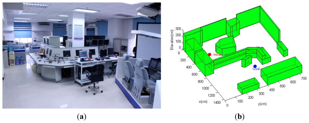For all of these experiments, we assume that the dynamics model of the quadrotor is non-linear and that the environment is without access to GPS signals. The quadrotor must start from an initial spot and traverse through the obstacles to a goal location, relying on a path-following control law and the state estimates provided by an EKF estimator. The exteroceptive sensor equipped on the quadrotor is assumed to be a simulated laser rangefinder with a maximum sensing range of 2 m and a 240° field-of-view. For each of these environments, a 3D model of the environment is first generated using an RGB-D-based environmental modeling approach from our previous work [26]. The 3D point-cloud model is then transformed into a polyhedron-based model, which is used for path planning. The CL-RBT is implemented in MATLAB® and all simulations are performed in real time on an Intel 3.2 GHz platform with a 4 G RAM. The CL-RBT algorithm selects and executes the best parts of the paths every Δt seconds.