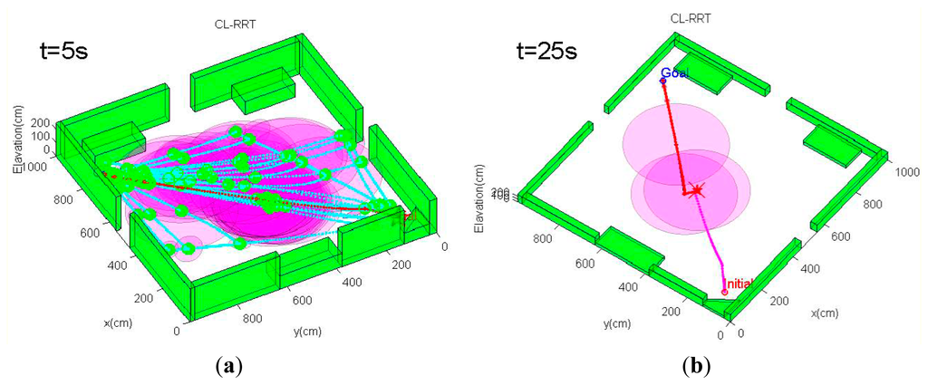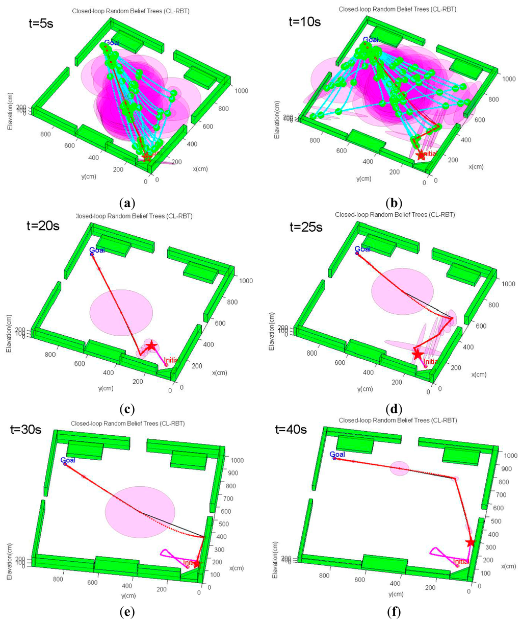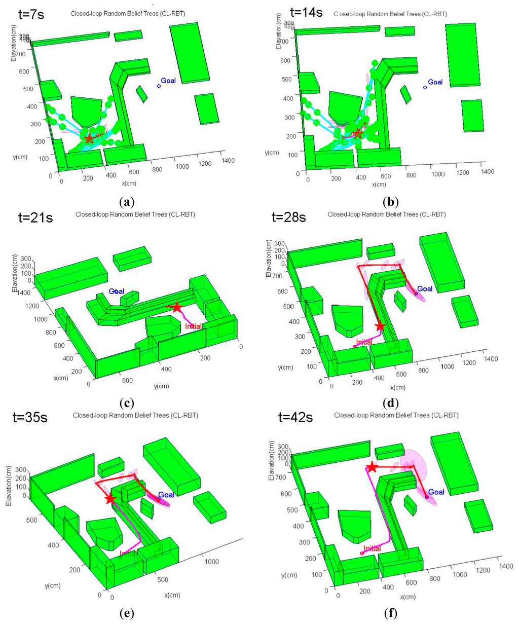 In contrast, by expanding the path using the conventional CL-RRT and checking obstacle collision constraints, the resulting paths will move the MAV straight to the goal (Figure 9). Although the conventional CL-RRT may generate shorter paths, ignoring the localization factors will result in high localization uncertainty, since these paths may go through the open regions. In this case, following these paths would likely cause operation failure, since the state estimate becomes unacceptably uncertain, such that the MAV control would have become unstable.