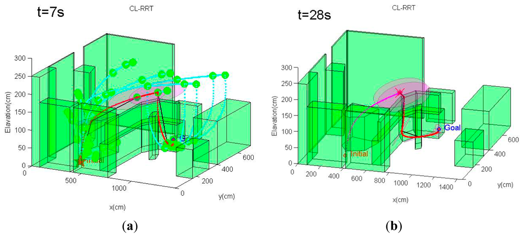 For this scenario, the quadrotor MAV begins from one side of the environment at xinitial =[3.2 6.4 0.0]T, and it is intended to navigate to the goal point behind a cluttered region of obstacles at xgoal =[10.0 4.0 0.5]Tm. The same MAV dynamics model, PID control scheme and sensor configuration as in Scenario 1 are also applied in this scenario. However, we select weighting factors in Equation (19) as ζ1 = 1, ζ1 = 20, ζ3 = 30, since the emphasis of this scenario is on generating feasible trajectories that quickly reach the goal while reducing localization uncertainty. The planning cycle in this scenario is extended to 7 s. The conventional CL-RRT is also tested using the same scenario and MAV system model for comparison purpose.