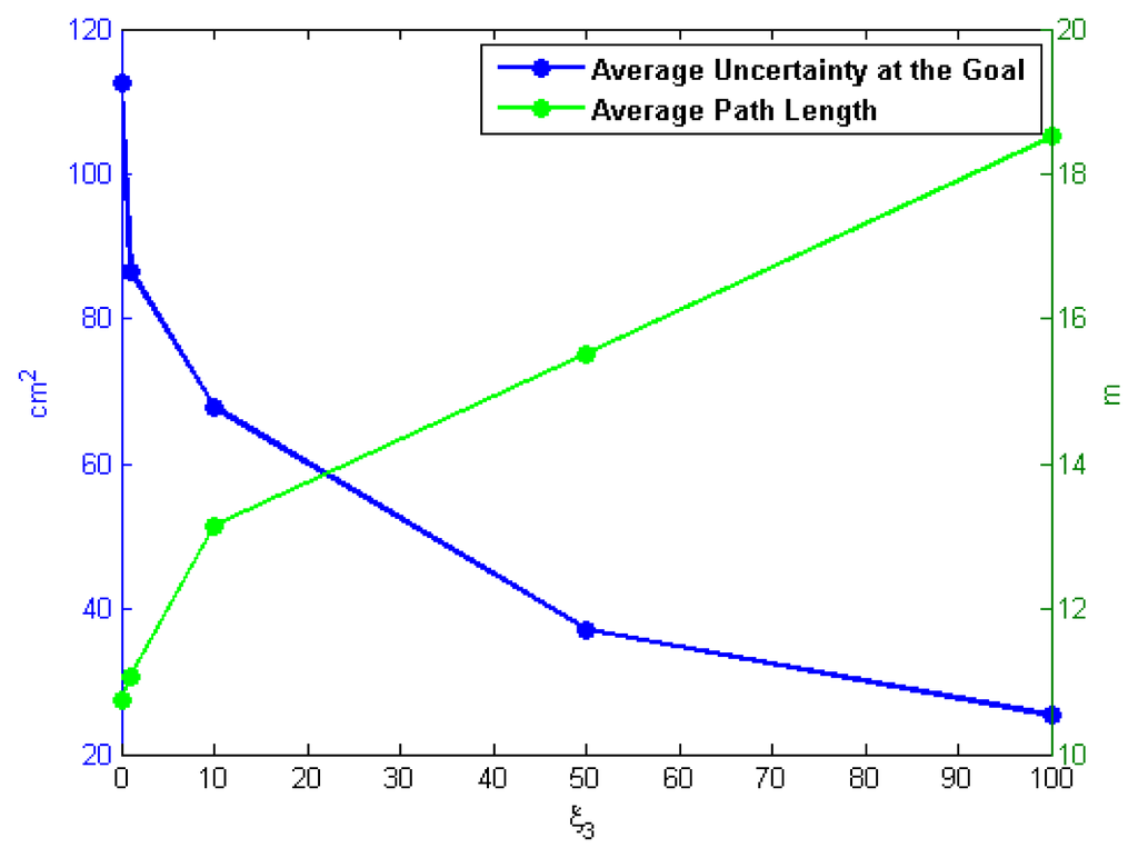 As discussed previously, the specification of weighting factors in the cost function for path selection Equation (19) is an important factor for implementations of CL-RBT. To evaluate the effect of the selection on weighting factors, we have conducted a number of simulations with different values of weighting factor ζ3 in Scenario 1. Five different values of ζ3 are evaluated in these simulations: ζ3 = {0, 1, 10, 50, 100}. For each of the five values, the simulation is repeated 10 times, and the path length and uncertainty cost (trace of the covariance) at the goal are recorded and averaged. Figure 13 illustrates the resulting paths' average length and uncertainty cost at the goal as a function of ζ3. As can be seen from the figure, the uncertainty cost decreases as the weighting factor ζ3 increases, whereas the path becomes comparatively longer. This is because reducing localization uncertainty becomes relatively more significant as ζ3 increases, resulting in longer paths that take more measurements from the environment. These results demonstrate that the weighting factors of the cost function should be carefully selected depending on the specific task requirement and the characteristic of the environment.