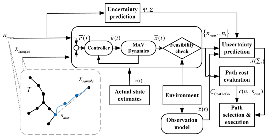 In contrast, sampling-based motion planning strategies have been widely acknowledged as effective approaches for solving motion planning problems with high dimensional configuration space and complex vehicle dynamics. In particular, the PRM (probabilistic roadmap) [15] and RRT (rapidly exploring random trees) [16] and their variants are the most widely applied sampling-based approaches, and they have been successfully applied in a number of applications. More recently, the closed-loop RRT [9,17,18] extends the conventional RRT by incorporating forward prediction using closed-loop dynamics model with controller. The CL-RRT can generate more feasible paths that account for complex vehicle dynamics, and it can be implemented in real-time to handle dynamic, uncertain environments. Several approaches have been proposed to incorporate state uncertainty in the sampling-based motion planning framework. Van den Berg et al. [19] proposed the LQG-MP strategy by integrating the a priori distribution over state estimates into the standard RRT framework. However, the LQG-MP algorithm is intractable for real-time applications, due to its high computation cost. In [20], Bry et al., combined an LQG-based covariance pruning technique with the RRT* framework for planning in belief space. Alternative to RRT-based approaches, the belief roadmap (BRM) extends the PRM by integrating the predictions of state estimation uncertainty using an EKF (extended Kalman filter) estimator and performs belief planning by searching paths with the lowest uncertainty from the roadmap. The BRM was later extended to use the UKF estimator and heuristic sampling strategy [21], and it was further implemented on a quadrotor and proven successful for indoor flight tests [22]. However, the BRM assumes that the vehicle is fully controllable and treats the problem as a simple kinematic motion planning problem, e.g., it does not consider complex vehicle dynamics and the feasibility of the generated paths. As a result, it is not yet well suited to vehicles with complex dynamic constraints and dynamic environments. In addition, the BRM operates by planning on pre-constructed static graphs, and therefore, it is not a real-time planning algorithm in essence. Recent research has also considered another similar kind of planning problem with uncertainty, where the planner must generate paths that maximize information collection and reduce the uncertainty on the location estimates of features or targets in the environment. The information-rich RRT (IRRT) [23] addresses this path planning problem by incorporating the qualification of information gain into the CL-RRT framework, using the Fisher information matrix. This kind of problem can be regarded as the inverse problem of planning with uncertainty on the vehicle's own state.