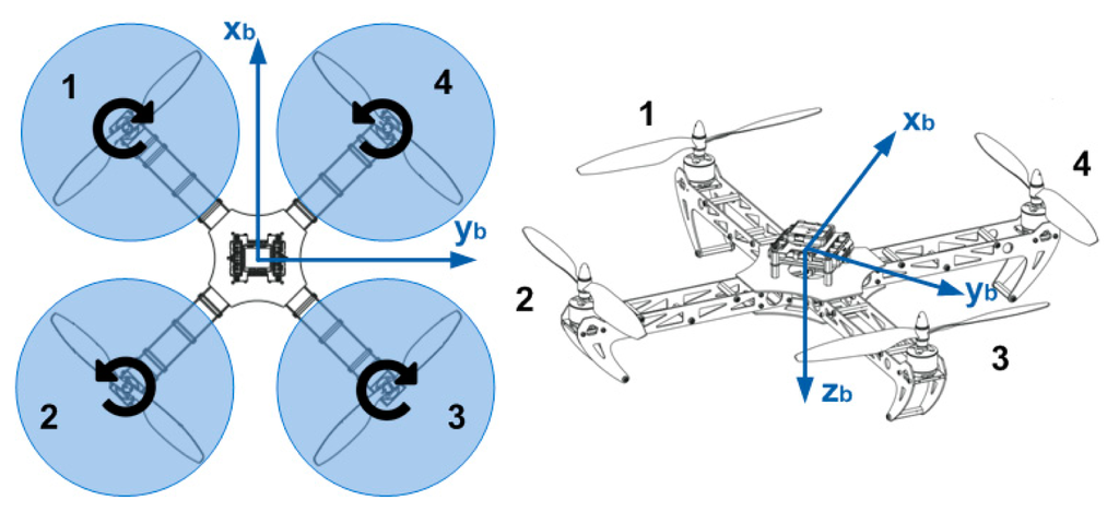 The configuration of the quadrotor utilized in this paper is illustrated in Figure 3. Two coordinate systems are considered in our scheme: the navigation frame (Earth-fixed frame) (xE, yE, zE) and the body-fixed frame (xb, yb, zb). The translational and rotational motions of the quadrotors are achieved through the forces and moments caused by varying the angular rates of the four propellers. Assuming that the quadrotor structure is rigid and symmetrical and the center of mass coincides with the origin of the body-fixed frame, the equations of motion of the quadrotor can be derived using Newton's law and Euler equations [27]. Define φ, θ, ψ as the Euler angles denoting the roll, pitch and yaw attitude, respectively, the rotational dynamics can be described as: