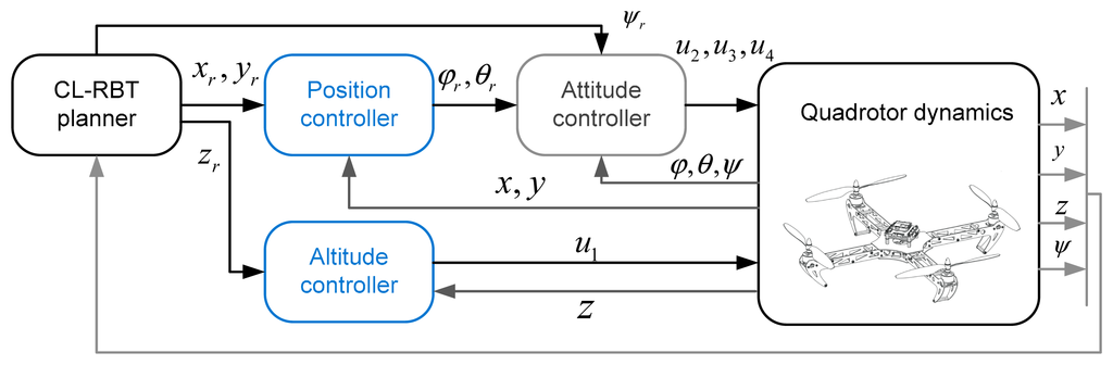 Using the decoupled rotational and translational dynamics in Equations (24) and (25), we can design a cascaded control scheme consisting of the inner control loop and outer control loop, of which the control laws can be designed separately. As illustrated in Figure 4, the outer control loop is the position and altitude controller, which receives the reference path from the CL-RBT planner and generates the reference roll and pitch commands (φr, θr) to the inner attitude control loop, while the attitude controller produces the desired rotor speed to achieve the reference attitude according to the attitude commands φr, θr, ψr.