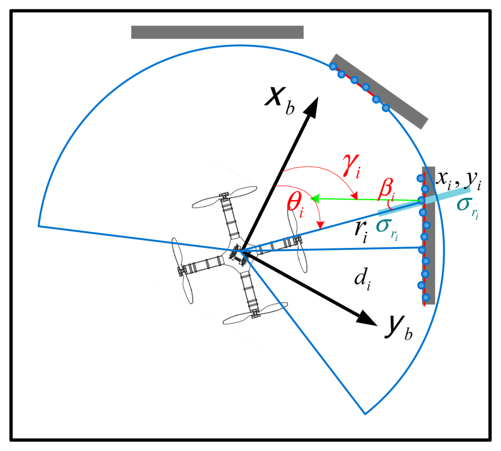 For a quadrotor using a laser rangefinder, the information matrix N in Equation (11) denotes the information provided by laser scans, which can be calculated by combining the information of each range measurement of the environment. Considering an environment geometry shown in Figure 5, a laser scan obtained at time t consists of measurements of n scan points in the environment, each of which is described by a range reading ri and a measurement angle θi, and the information provided in a laser scan (ri, θi) is in the direction perpendicular to the topology, i.e., the direction of the vector normal (the vector in green, Figure 5) of the environment surface. Therefore, the information matrix can be obtained by projecting the range information onto the vector normal of the surface and summing the projected information of each scan point. The information matrix N can be calculated by: