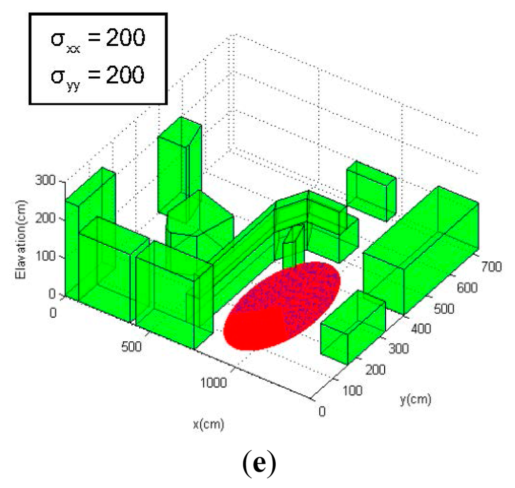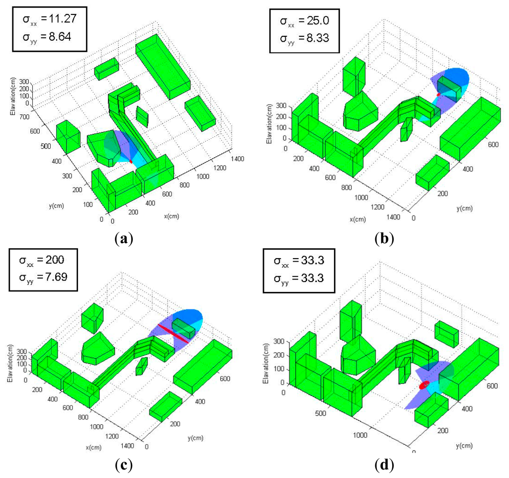 Figure 6a–e show the uncertainty ellipses related to the position estimation uncertainties along a predefined path calculated using the information matrix equations proposed in this section, as well as the covariance propagation approaches in Section 4. In the experiments, an 18 × 9 m 3D environment model is derived from a cluttered real-world laboratory, and the MAV is assumed to be equipped with a simulated laser rangefinder that is able to generate range and bearing measurements of the environment. In order to highlight the influences of the environment, the laser sensor model is assumed to have a limited sensing capability with a 2-m range and a 240° field-of-view, which is represented by blue sectors in the figures (Although this sensor model is unrealistic in terms of maximum range, it serves well to illustrate how the environment and sensor measurement affect the localization uncertainty). As the MAV navigates along the path and rotates its orientations, the environment topologies that fall within the field-of-view will generate a series of noisy measurements of the topologies' distance and bearing to the MAV body (the valid measurements are demonstrated by the cyan sectors in the following figures), enabling the MAV to localize itself by a EKF-based approach using these measurements of the environment. The 1–σ position uncertainty is demonstrated by red ellipses in the figures, and the size and shape of the ellipses indicate the relative scale of the localization uncertainty in both x and y directions.