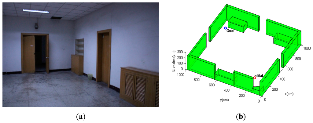 The environment of the first scenario is shown in Figure 7a. As can be seen from Figure 7, this scenario is a 10 × 10-m open indoor environment with all structures concentrated along the peripheral walls, and the center of the environment is an open region that is out of the measurement range of the simulated laser rangefinder. The MAV quadrotor must navigate from the initial position at the bottom-right corner through the hallway to a goal region, which is diagonally opposite of the initial point. Since most of the environment provides rare measurement for localization, it is even more critical for the path planning strategy to find paths that maximize information gain and reduce state uncertainty; hence, the emphasis of this simulation scenario is to test the path planning algorithm's ability to generate paths that ensure the MAV's localization performance throughout the path. For comparison purposes, the conventional CL-RRT algorithm without the incorporation of state uncertainty is also tested using the same MAV model and environment configurations.