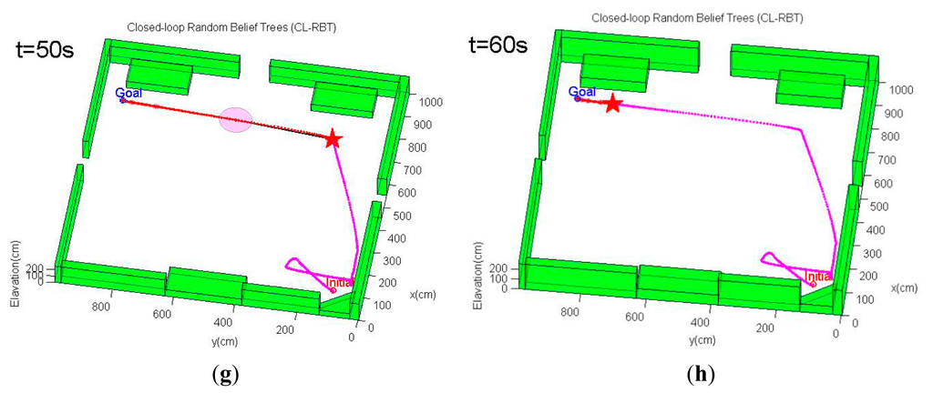 Figure 8 demonstrates an example trajectory generated by a trial of the simulation scenario. The CL-RBT algorithm quickly generates a feasible path that goes through the regions with as much measurements as possible to localize and reaches the goal (Figure 8a,b). Since a comparatively small amount of samples and nodes are generated during the initial planning, the initially selected paths may still reach the open regions with comparatively high localization uncertainty (Figure 8c–e). However, as more samples and nodes are added, the CL-RBT continuously refines the path in real time, identifying optimal paths that go through measurement-rich regions to ensure localization and reduce the execution cost of the goal (Figure 8f–h).