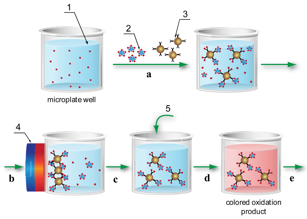 Using the MNPs as the solid phase allowed a significantly increased surface area for the immobilization of the reactants (see Section 2 of the Supplementary Material) and their uniform distribution throughout the whole volume of the reaction medium, thereby eliminating the diffusion limitations of traditional ELISA. The application of a magnetic field separated the reactants simply and rapidly, and facilitated the wash steps that are also required in traditional microplate-based ELISA. Using these advantages, the following MNP-based immunoassay scheme was developed and implemented in ELISA microplate wells (Figure 1).