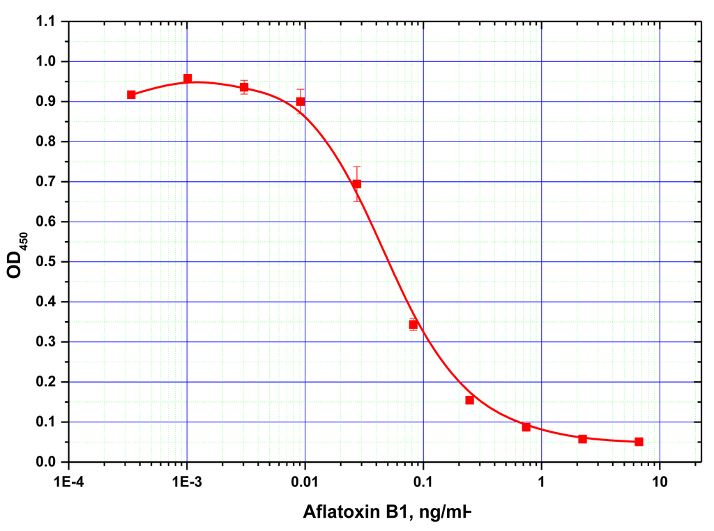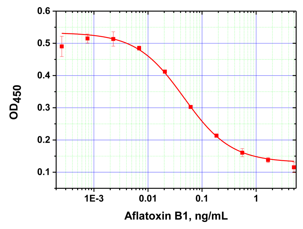 Absorbance of the peroxidase reaction product is recorded; this reflects by inverse proportion the AFB1 content in the sample.