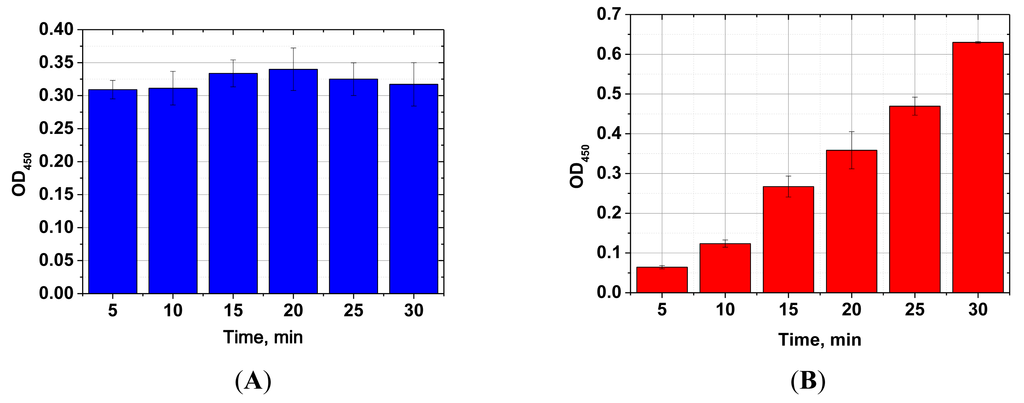 For comparison, Figure 5 presents the reaction time study of the same immune interaction using conventional microplate ELISA. Increased signal was observed with increasing incubation periods, and no signal plateau was reached, even at the maximum incubation period tested (30 min). This illustrates the significant advantages of the proposed system over conventional ELISA for development of an express immunoassay.