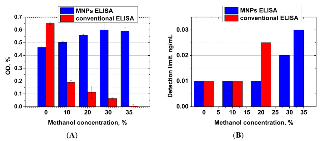 Our proposition is to use the formed complexes of magnetic nanoparticles, immobilized antibodies and bound antigen molecules directly in the ELISA. Increased stability of immobilized antibodies to denaturation will be applied to test samples with relatively high content of methanol. The distinguishing feature of the method proposed here is the use of highly dispersed (average diameter of 10 nm) magnetic carriers and the simple adsorption of antibodies.