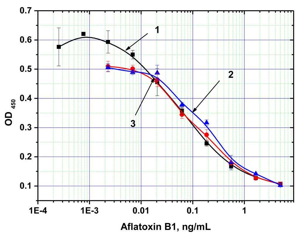 In this paper, we describe the realization of an express immunoassay using magnetic nanoparticles for the mycotoxin, aflatoxin B1 (AFB1). Because of multiple toxic effects, AFB1 is one of the priority contaminants for monitoring and control in agricultural products and foodstuffs [26,27]. Nowadays, several commercial ELISA kits for AFB1 are manufactured, e.g., Total Aflatoxin ELISA Kit, EuroClone SpA-LOD 4 ng/g, Milan, Italy; Aflatoxins B1 [AFB1] ELISA Test Kit-LOD 1 ng/g, Krishgen Biosystems, Los Angeles, CA, USA, Total Aflatoxin ELISA Test Kit (Bioo Scientific, Austin, TX, USA-LOD 0.5 ng/g). They allow to find exceeding maximal residue levels for main foodstuffs (official MRLs are from 2 to 12 ng/g), but not enough for special kinds of food, such as baby food with MRL = 0.1 ng/g (Commission Regulation [EU] No 165/2010). Low LODs for AFB1 ELISA may be found in some research papers, such as 10 pg/mL and 90 pg/mL in [14,15], respectively. However, such LODs are achieved through complicated chemiluminescent detection.