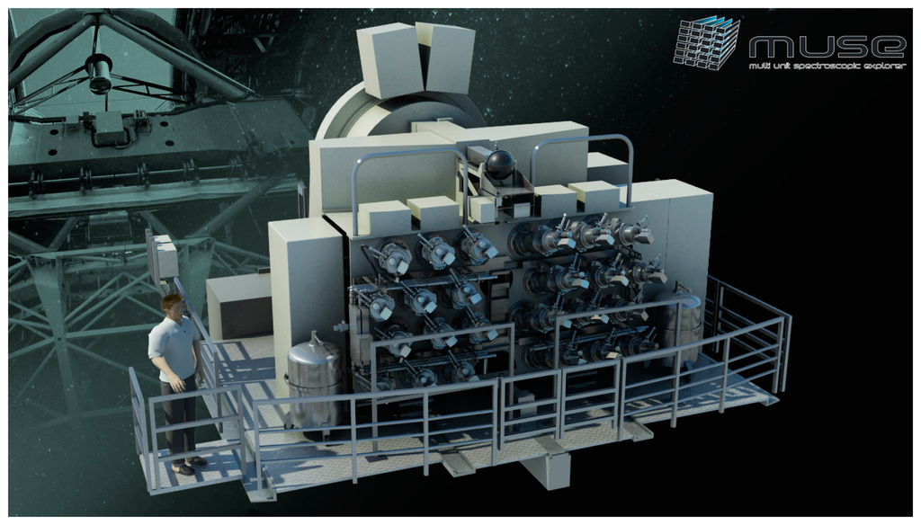 In contrast, a similar problem in modern astrophysics, namely spatially resolved spectroscopy of faint extended galaxies, has been solved by introducing the method of Integral-Field Spectroscopy (IFS) already more than two decades ago. First generation highly efficient integral field spectrographs have provided many spectra of order several hundreds to thousands over a full 2-dimensional field-of-view simultaneously in a single exposure []. Today, IFS is an established common-user technique at all major observatories. Second generation IFS instruments, e.g., VIRUS for the Hobby Eberly Telescope in Texas [], or MUSE (Multi Unit Spectroscopic Explorer) for the Very Large Telescope at the ESO Paranal Observatory in Chile [], provide more than one order of magnitude more spatial elements. MUSE e.g., delivers a total of 90,000 individual spectra, resulting in spectral images of 300 × 300 spatial elements (“spaxels”). This instrument covers a free spectral range over one octave from 465 nm to 930 nm with a spectral resolution of ∼0.25 nm and unprecedented sensitivity. In order to master the extremely high multiplex gain and, consequently, the complexity of the instrument, a modular design was adopted. It incorporates, amongst various other subsystems, a total of 24 highly efficient identical spectrographs. MUSE was designed to discover the faintest galaxies of the universe that would be invisible by other methods. Very high efficiency is accomplished by an optimized high-throughput and low aberration refractive collimator-camera system, a volume phase holographic grating, and a graded-index AR-coating, liquid nitrogen-cooled 4096 × 4112 pixel CCD detector (CCD231, e2v, Saint-Egrève Cedex, France). A conceptual sketch of the instrument, that was commissioned at Unit Telescope 4 of the VLT in March 2014 and has undergone science verification in June 2014 [], is shown in Figure 1.
