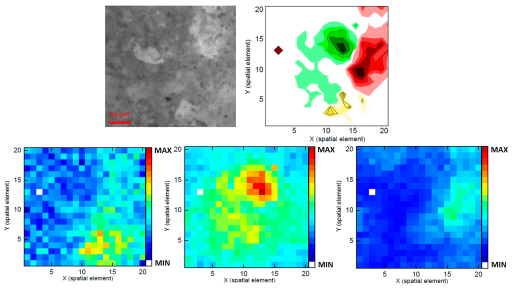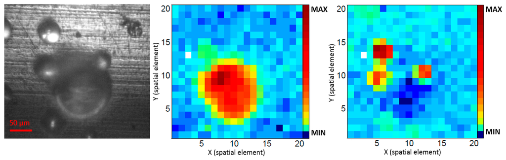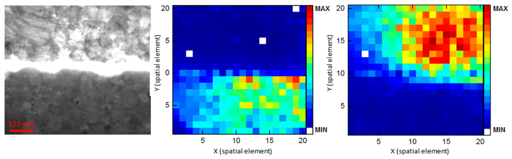 Figure 7 shows the intensity distributions at certain Raman shifts at the position of the probe head. Although the free space setup was not optimized for imaging, patterns of a first Raman map could be observed. To receive the respective Raman signal intensities, the peaks at 1129 cm−1, 1449 cm−1, and 1659 cm−1 were fit to Gaussian functions and converted into pseudo colors. In Figure 7 the red color represents the highest and blue the lowest signal intensity. White spots indicate damaged fibers, which did not provide an analyzable signal.
