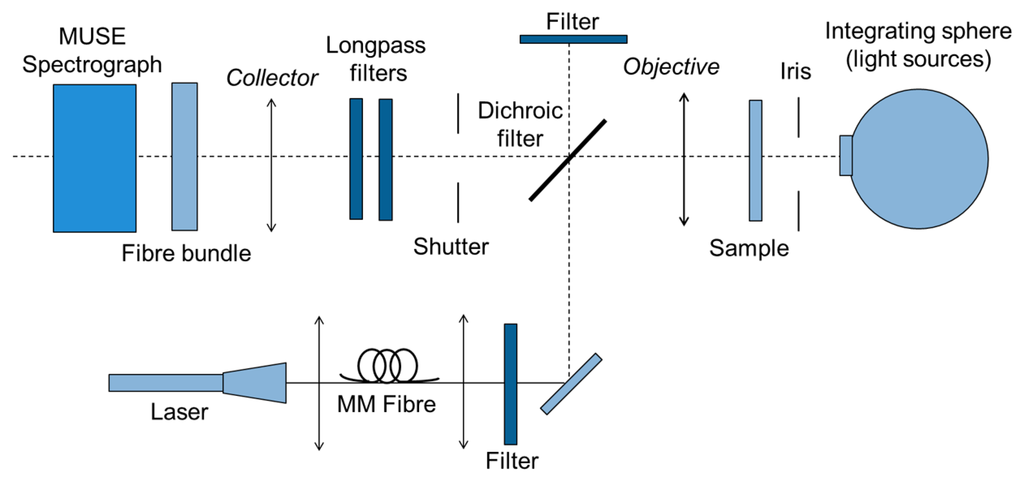 - Roth, M.M.; Zenichowski, K.; Tarcea, N.; Popp, J.; Adelhelm, S.; Stolz, M.; Kelz, A.; Sandin, C.; Bauer, S.-M.; Fechner, T.; et al. The ERA2 facility: Towards application of a fibre-based astronomical spectrograph for imaging spectroscopy in life sciences. Proc. SPIE 2012, 8450. [Google Scholar] [CrossRef]