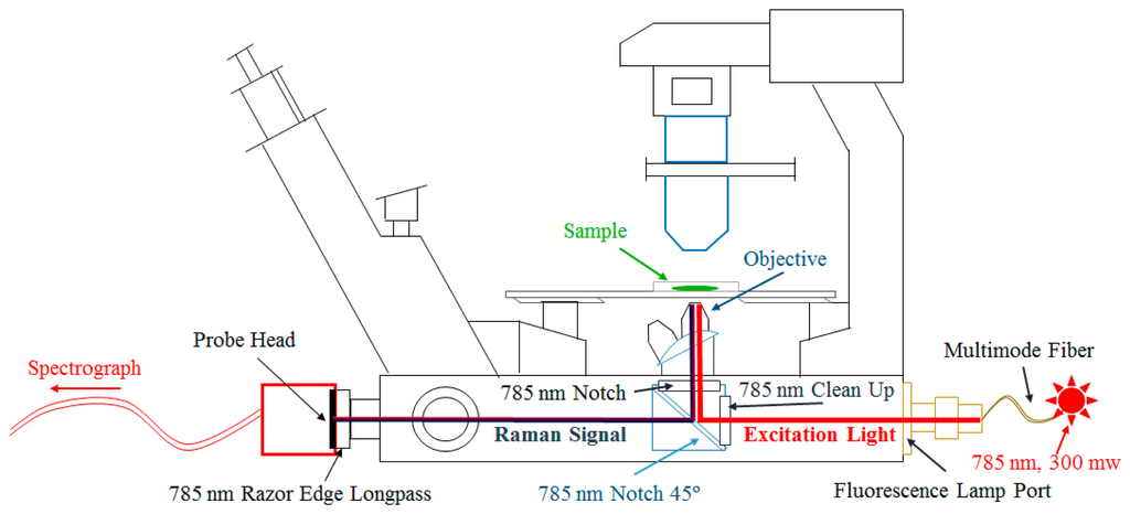 To improve the imaging quality, a second setup with use of a microscope was realized. The probe head with the fiber array was placed at the camera output of an inverted fluorescence microscope (Axiovert.A1 FL, Zeiss, Jena, Germany). Figure 4 shows a scheme of microscope setup. A fiber-coupled 300 mW 785 nm diode laser from a commercially available Raman spectrometer (i-Raman, B<mp;W Tek, Newark, DE, USA) was used as excitation light source. The laser light was coupled to the microscope via the fluorescence lamp port using a 105/125 μm multimode fiber and a collimator. The fluorescence filter cube of the microscope contained a 785 nm clean-up filter, a 785 nm notch beam splitter, and a 785 nm notch filter as emission filter. Additionally, a 785 nm long-pass filter was placed in the front of probe head. The microscope was equipped with 2.5× and 20× magnification objectives, which allow the capture of object fields with 10.0 and 1.2 mm diameters, respectively.