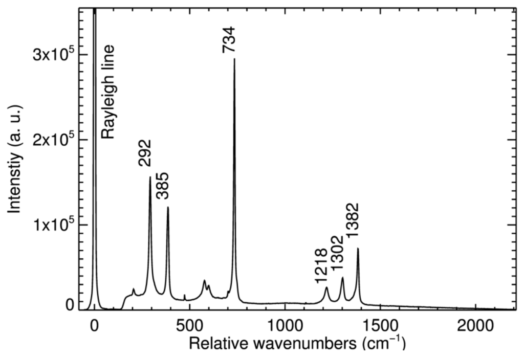 Initially, the free-space setup was used with a piece of Teflon, a paracetamol tablet, and a silicon wafer. Figure 5 presents the collected Raman spectrum of Teflon. The curve represents the total signal of all 400 fibers. The exposure time was 60 s. The peaks at 292 cm−1 and 385 cm−1 (torsional and deformation vibrations of CF2), 734 cm−1 (symmetric CF2 stretching), 1218 cm−1 (antisymmetric CF2 stretching), 1302 cm−1 and 1382 cm−1 (C-C stretching), match the values specified in the literature []. This consistence proves that the MUSE spectrograph is generally suitable for Raman spectroscopy. In addition, the Raman spectra received with the free-space setup for paracetamol and silicon match the literature values (data not shown) [,].