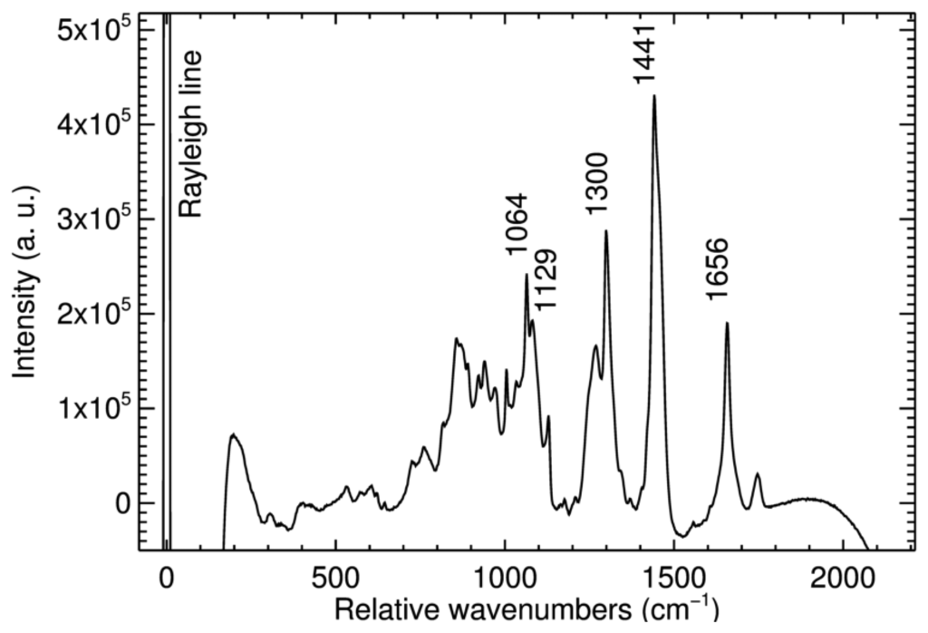 The detection of cancerous tissue is a potential future application []. As a tentative experiment, a piece of raw pork meat was examined, since the Raman signals of pork meat are expected to be similar to those of future tissue samples. Figure 6 shows the received Raman spectrum with well identifiable Raman signals. Again the curve represents the total signal of all 400 fibers. The exposure time was 240 s. Fluorescence background was reduced by use of a fourth-degree polynomial fit. The most intense signal peaks are observed at 1656 cm−1, 1441 cm−1, 1300 cm−1, and 1064 cm−1. 1656 cm−1 and 1300 cm−1 can be related to Amide I-helix and Amide III-helix, respectively []. 1441 cm−1 is linked to CH3, CH2, and CH groups, 1064 cm−1 to C-N and C-C bounds.