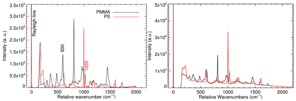 The heights of each characteristic peak, which resulted after the normalization procedures, were taken as measures of the substance concentrations. Figure 8 shows the Raman spectra received from sample (I). Left part: Added up and background-corrected Raman spectra of PS (red line; total intensity from 15 fibers positioned at the most intense regions of the image of the PS beads) and PMMA (black line; total intensity of 32 fibers positioned at the most intense region of the image of the PMMA bead). Right part: Two spectra from two single fibers as they were received from the spectrograph without further processing. The spectra are in accordance with literature values [,]. To remove background fluorescence, an automated algorithm for subtraction was used for all spectra. The chosen method is based on the modified polynomial curve fitting of Lieber and Mahadevan-Jansen [] fitting the background with a fourth order polynomial retaining the minimum intensity value at each wavenumber at each iteration using a total of 15 iterations per spectrum.