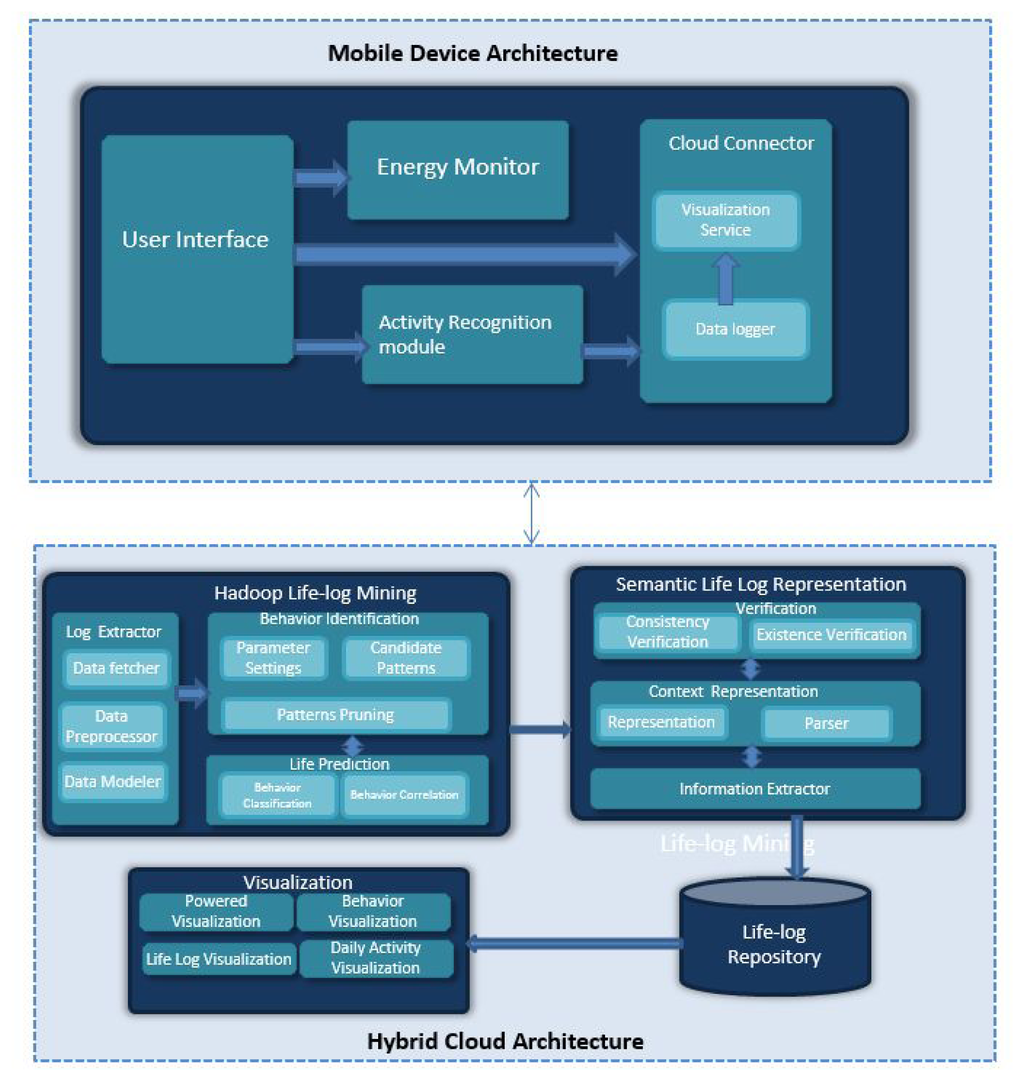 The visualization component within the architecture provide users with understandable visualization of the life log and user behavior based on data relayed from the mobile device.