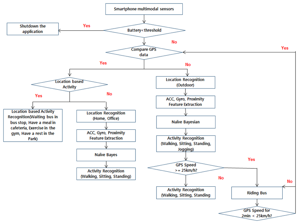 The user is located in outdoor area if the GPS signal is available and strong enough. The system recognizes the activity and then the location for differentiating indoors (Home and Office) and outdoors. If the user is at an unknown location, the system tries to recognize the activity among outdoor activities, i.e., walking, sitting, standing, jogging, rest in park, waiting at bus stop, having lunch in cafeteria, exercising in gym and riding a bus).