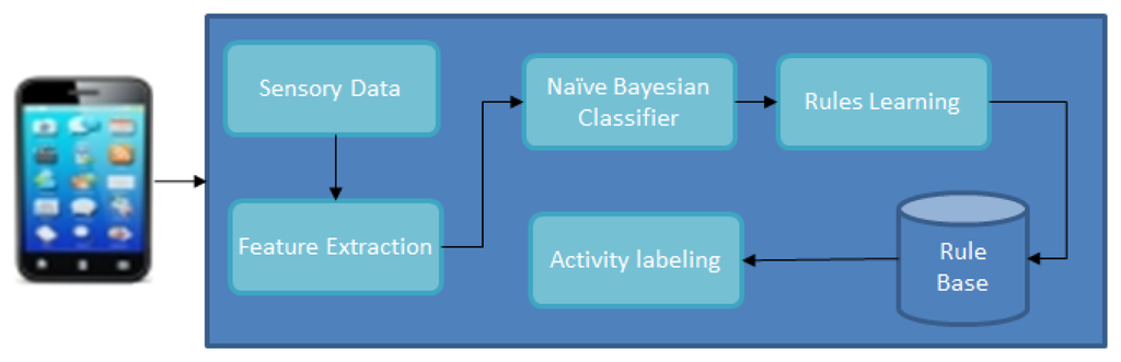 This model uses sensor data from accelerometer, GPS and Wi-Fi to identify activities like walking, sitting and standing mainly but are extended to more activities like (jogging, resting in park, waiting at bus stop, having lunch in cafeteria, exercising in gym and riding a bus) in outdoor locations. The mobile application makes use of several sensors, i.e., accelerometer, gyroscope, proximity and light sensors to identify different contexts. The overall flow of the application is given in Figure 2.
