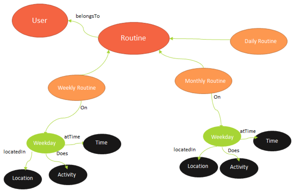 Figure 4 illustrates the structure of user routine ontology. A routine is usually repetitive or recursive. It can be a daily, weekly or monthly routine. As our activity recognition model has high importance on the outdoor locations and different user key locations, so a routine's most important characteristics are sequence of user locations, activities and the time interval user spends doing an activity at a location. This structure shows spatial and temporal attributes of a user routine.