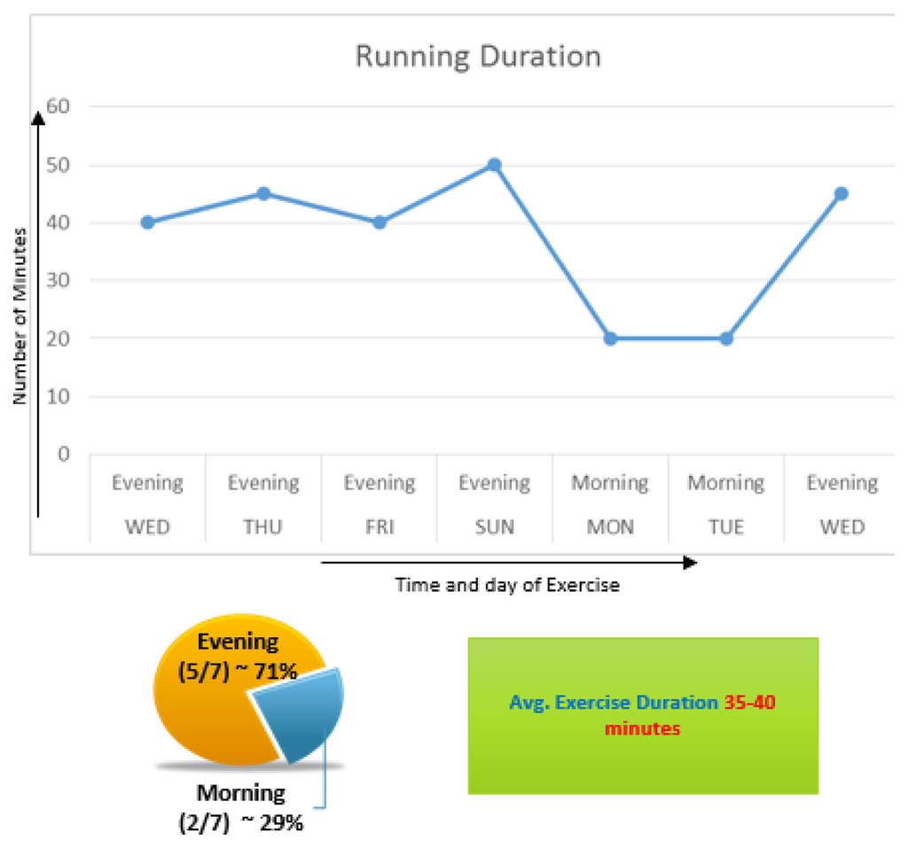Figure 5 shows a graph in which user running pattern is displayed. It shows how many minutes he jogged during each day and what part of day did he jog. Average jogging duration is displayed which can further help us determine the average calorie consumption per week. It shows that 71% of the running has taken place in the evening. This shows that the user is more comfortable jogging in the evening.