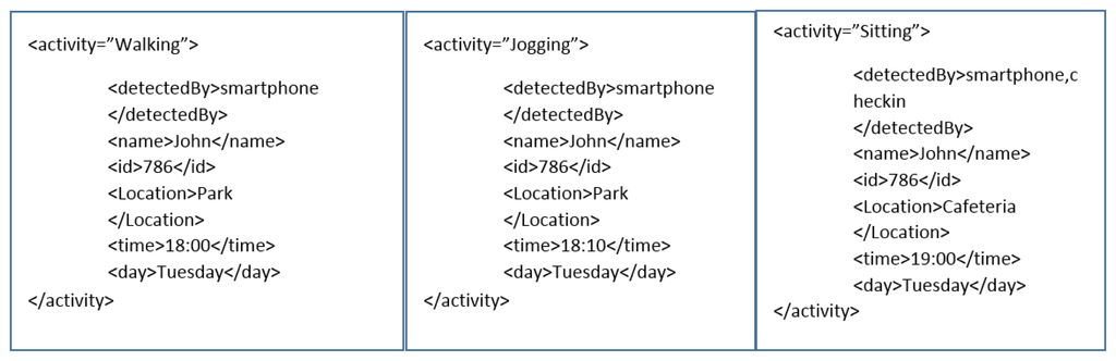 Figure 6 shows context information received by the behavior life style analysis. The first activity is walking around the park around 6 pm on a Tuesday. It means the user is back from work and taking a stroll in the park. Later in the second part the user is jogging 10 min later. This means he did a little exercise. At 7 pm the user is sitting in a cafeteria or restaurant. This indicate that he is going to have a meal. It also means that a certain amount of calories will be consumed. The food calories can be guessed from the restaurant check-in and user's life log history. From this an overall context can be extracted that the user calorie consumption is increased and he needs to be recommended a routine which will burn more calories. There can be a new rule generated against this routine which will be triggered in similar situations.