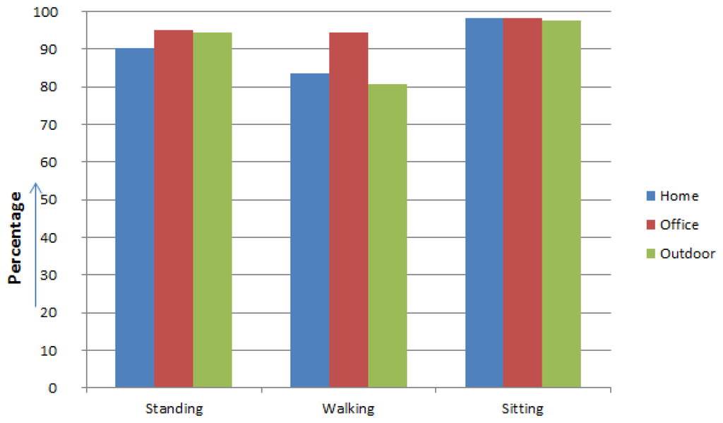 There are many cases which show different accuracy for the same activities. This indicates that the activity can be recognized differently depending on what the location is. For example, walking activities in the home or outdoors are sometimes recognized as a standing given that the user frequently stops to change direction for house or office chores. The recognition accuracy of both sitting and standing activities are relatively higher than the others due to their static nature as shown in Figure 7.