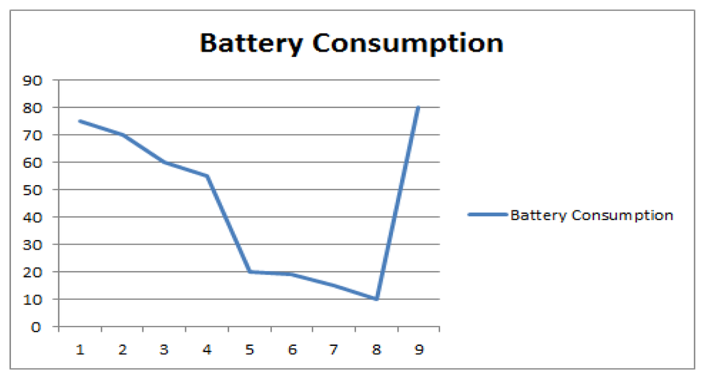 In Figure 8 a graph has been plotted with battery remaining in the mobile device when it sends the parameters. Here the mobile phone battery is constantly dropping. But there is sharp drop from around 55% of the battery to around 20%. This indicates that the resource consumption was very high at that point. A threshold can be defined when the battery life is 25% left, the application should stop monitoring the activities. Similarly at a particular threshold the application can stop using GPS for activity recognition. This affects the accuracy of the application and lower battery consumption ensures the longevity.