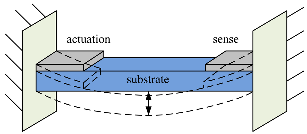 This study proposes the clamped–clamped beam-type piezoelectric vacuum pressure sensing element, a self-actuating and self-sensing microresonator, to detect the damping ratio of the gas, thus enabling the calculation of the pressure of vacuum system. The schematic diagram of the vacuum pressure sensing element is shown in Figure 1. The sensing element comprises a PZT layer, a substrate, and two pairs of electrodes. The electrodes are placed near both ends for piezoelectric actuation and sensing. When the sinusoidal voltage signal is applied to a pair of electrodes, due to the inverse piezoelectric effect, the clamped–clamped beam vibrates and resonates. Simultaneously, the other pair of electrodes captures the vibration energy and converts it to electric energy using the positive piezoelectric effect. Finally, we measured the output voltages which varied under different gases viscosity and vacuum pressures.