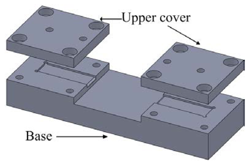 To allow the sensor to maintain the same boundary conditions during each measurement, we designed a fixture that can keep the cantilever beam fixed at both ends. The fixture contains two parts: upper cover and base. The upper cover has two holes for electrical wires. The clamped–clamped piezoelectric beam is placed in a trench in the base. Four M2 screws were used to fix the upper cover and the base which is shown in Figure 3. The fixture is made by transparent acrylic material which has advantages such as low density, high mechanical strength, good tensile and impact resistance, high transparency, low cost, and ease of machining.