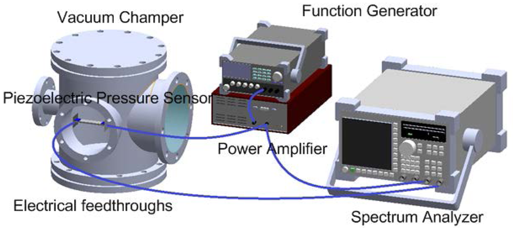 The experimental setup is shown in Figure 4. The clamped-clamped piezoelectric pressure sensor was fixed by the fixture and was placed in the vacuum chamber. Electrical feedthroughs were used to transfer electrical signals through the vacuum system wall. A sine wave was generated by a function generator (33220A, Agilent, Santa Rosa, CA 95403-1738, USA) and amplified by a power amplifier (PZD700, TREK, Lockport, NY, USA) to excite the piezoelectric beam at first resonance frequency. At the mean time, a spectrum analyzer (Agilent 35670A) was used to measure the frequency response of input and output voltages.