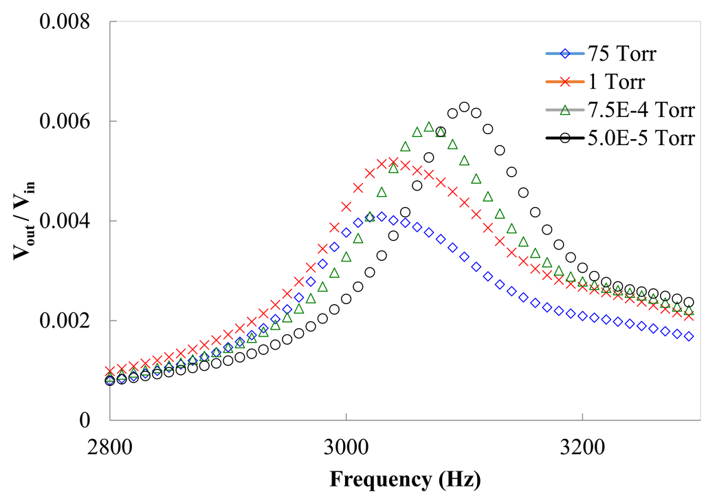 Frequency response functions were obtained by the following steps. The spectrum analyzer generated a swept-sine signal to drive a pair of electrodes through an amplifier. In the meantime, the other pair of electrodes generated electric output. Both the swept-sine signal and the output voltage were fed back to the spectrum analyzer to calculate the frequency response function. To maximum sensor output, the piezoelectric beams were excited at the first resonance frequencies under different pressures condition in the following experiments. The data from measured frequency response functions were processed to extract damping ratios using half power method. Figure 5 shows the frequency response functions of a clamped–clamped piezoelectric beam under different pressures when the residue gas in the vacuum chamber is nitrogen. The clamped-clamped piezoelectric beams have maximum output and input ratio when the beams were excited at resonance frequencies. The resonance frequencies of the piezoelectric beam under the vacuum pressures at 5 × 10−6, 7.5 × 10−4, 1 and 75 Torr were 3100, 3067, 3038 and 3030 Hz, respectively. When the pressures in the vacuum chamber decreased, the resonance frequencies and the resonance amplitudes of beam decreased because the damping coefficient of gas increased. The difference of first resonance frequencies of the vacuum sensor between 75 torr and 5 × 10−6 torr was just 2.25% (70 Hz) because of tiny damping variation. The resonance amplitude, output and input voltage ratio, were 0.0063, 0.0059, 0.0052 and 0.0032, respectively, when the pressures were 5 × 10−6, 7.5 × 10−4, 1 and 75 Torr.