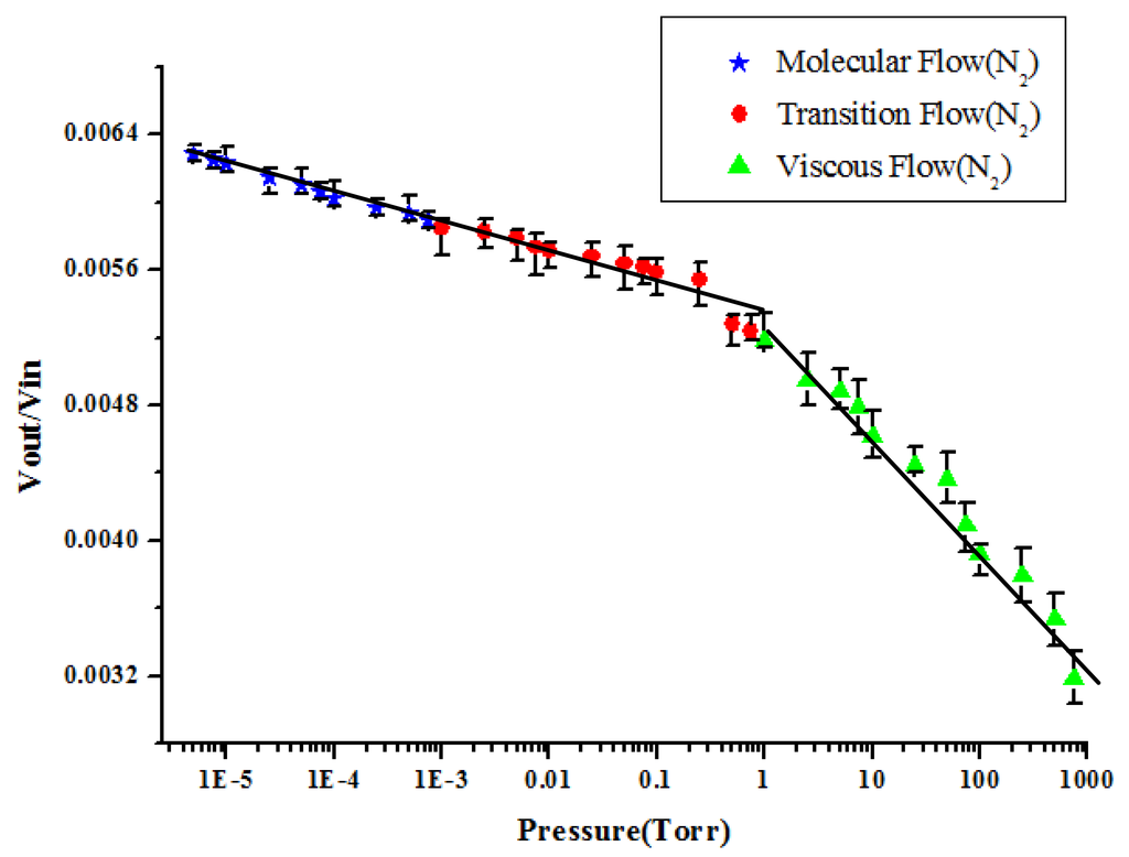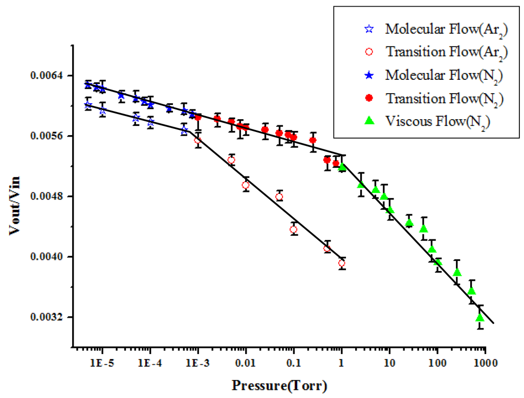 Each experimental corresponding to different pressures under Nitrogen and Argon was repeated 10 times and the average values of output voltage were reported. Experimental results were consistent if that boundary condition remained the same. Pressure measurement was taken after observing the steady state condition to prevent measurement errors. However, the duration of steady state condition varies for the flow in the continuous region to the flow in the molecular region. One of the samples was leaved in the vacuum chamber for 3 months and there were no significant difference even the sample was driven for a long time. However, there still need further research to study the consistency and stability of the system. There also still need further research to study the different gases to verify the consistency and stability of the system.