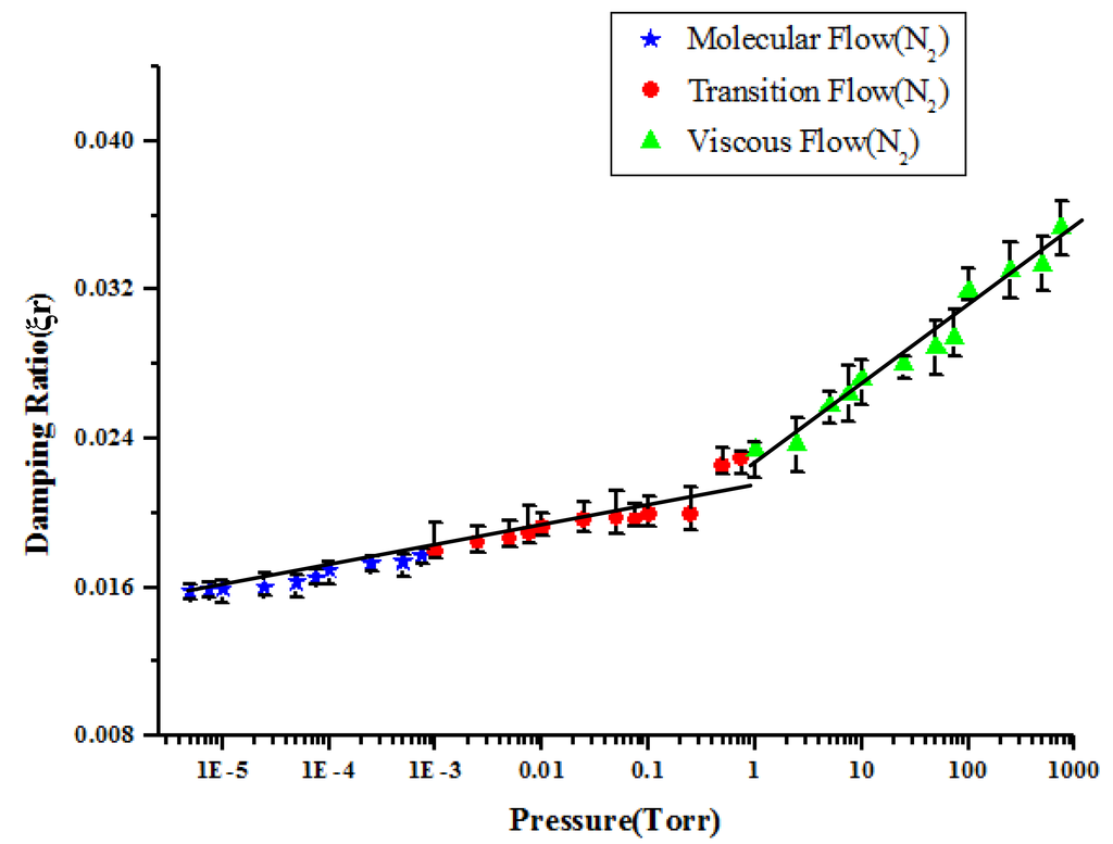 The data from measured frequency response functions in the previous experiments were processed to extract damping ratios using half power method. After processing, we obtain the damping ratio corresponding to the respective pressure. Figure 7 showed that the damping ratios versus the vacuum pressures in the chamber when the residue gas is nitrogen. The slopes of the damping ratios vs. pressure in the viscous flow region is y = 0.0009x + 0.0206 and R2 = 0.957. The slopes of the damping ratios vs. pressure in the transition flow region is y = 0.0018x + 0.0226 and R2 = 0.8574. The slopes of the damping ratios vs. pressure in the molecular flow region is y = 0.0042x + 0.0225 and R2 = 0.9592. However, fitting in three regions may not be the best solution. It also looked that the data in the molecular flow and transition flow region could be fitted with one straight line instead of two. The slopes of the voltage vs. pressure from 5 × 10−6 to 1 torr is y = 0.0013x + 0.0216 and R2 = 0.916.
