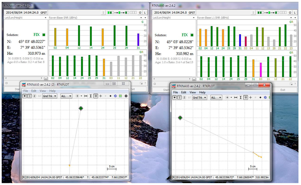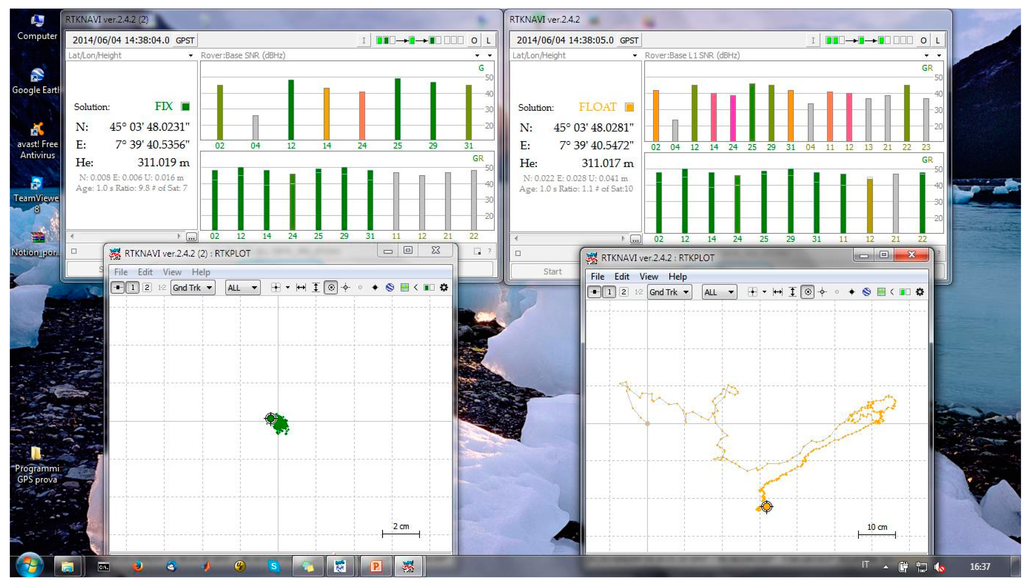 To perform NRTK positioning, the routine RTKLIB V. 2.4.2 was used [25]. In particular for these experiments the RTKNAVI tool was used. This tool allows input for both raw data (pseudorange and carrier-phase measurements) of the u-blox and NVS receivers (simultaneously, as in Figure 3) and stream data coming from a network with NTRIP authentication. The RTKNAVI software uses a modified LAMBDA method for fixing integer ambiguities. The LAMBDA method [26] has been widely used in GNSS positioning. For real time applications computational speed is crucial: the modified LAMBDA (MLAMBDA) method [27] reduces computational complexity of the LAMBDA method.