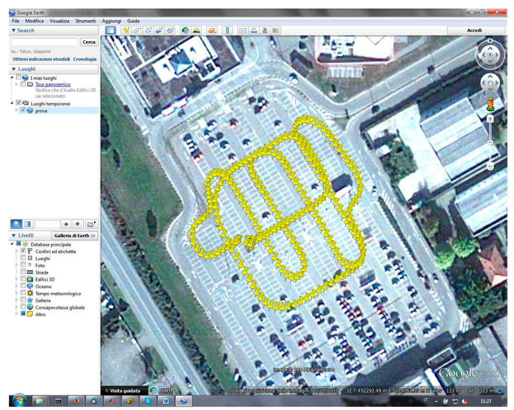 The first experiment corresponded to the CORS post-processing approach: we used a real permanent station eight km from the rover. Data were acquired simultaneously using the same antenna (Garmin GA38) connected to the splitter using a sampling rate of 1 s. The average values of Position Diluition of Precision (PDOP) were approximately 1.2. As stated, the results were obtained in the “single base” mode using commercial software (Leica Geomatics Office™ v.8.3 by Leica Geosystems®).