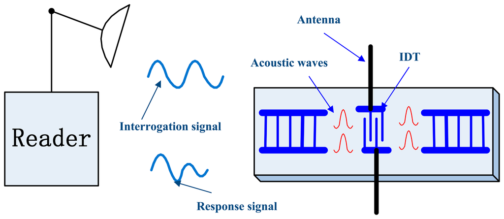 The operation principle of a passive wireless SAW resonant sensor system is illustrated in Figure 1. The interrogation unit emits a high frequency electromagnetic wave (radio frequency (RF) interrogation signal) to activate a passive SAW resonant sensor, which consists of a piezoelectric substrate and a one-port SAW resonator. The interdigital transducer (IDT), which is connected to the antenna, , transforms the received electromagnetic wave into a narrow-band SAW with the help of the inverse piezoelectric effect. The practical resonant frequency depends on the structure of the resonating cavity and the environmental influences the resonator is exposed to. After the stimulating signal is switched off, the in-band various frequency components of the SAW oscillate freely damped with different time constants. The SAW returns to the antenna for retransmission to the interrogation unit as an electromagnetic wave with the help of IDT. The longest echo duration is achieved only when the frequency of the emitted electromagnetic wave is equal to the resonance frequency of SAW resonator. The interrogation unit evaluates the frequency of this damped electromagnetic wave and determines the value of the measurand.